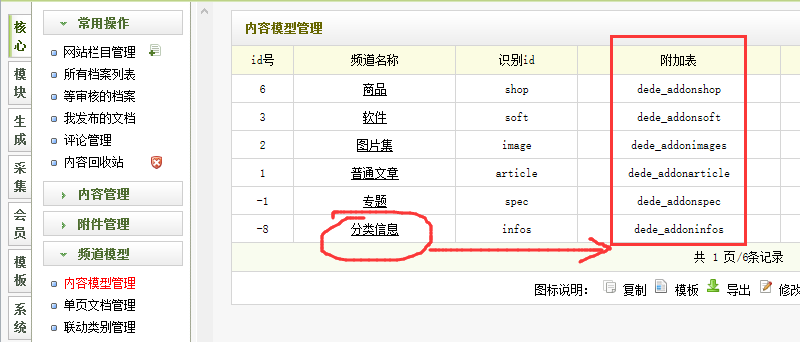 注意:dede_addoninfos 是你的附加表名,如下图: